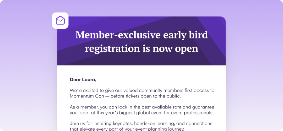 Early bird registration is a simple way to reward members and build excitement before your event. It gives them the chance to secure tickets ahead of the general public, making them feel valued while also creating a sense of exclusivity.